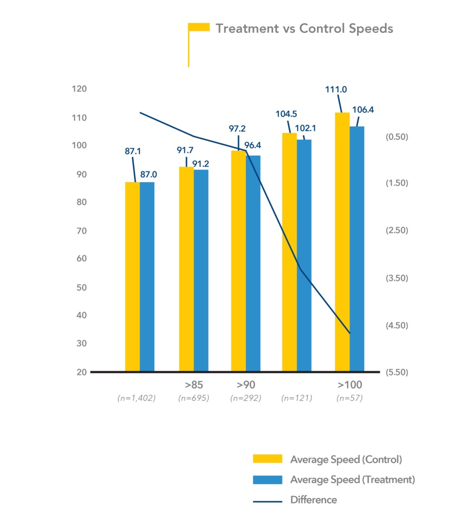 The intervention led to a statistically significant decrease in the average speed of cars travelling over 100 km/h by around of 11.5%. Disaggregating results show that drivers in higher speed brackets exhibited greater reductions in speed than drivers in lower speed brackets.